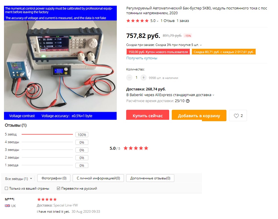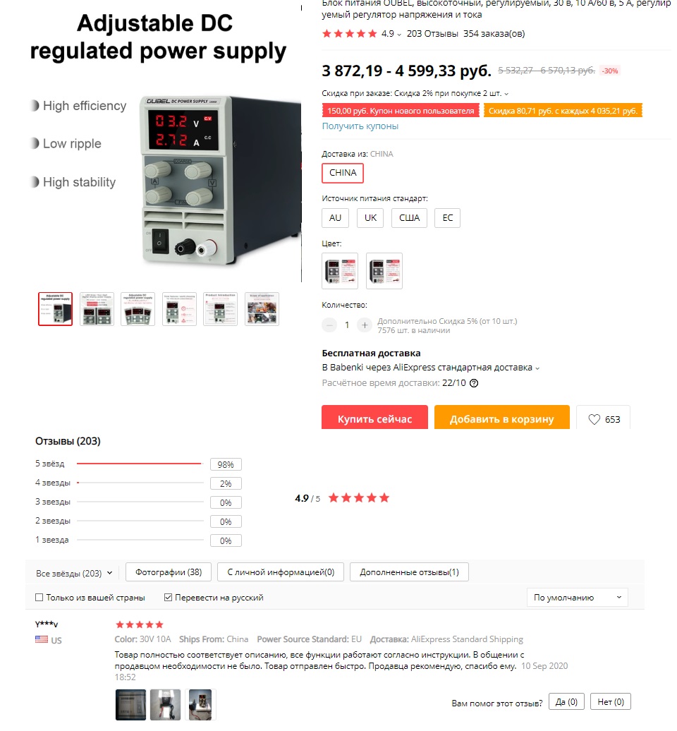 Продавец описывает лабораторный регулируемый блок питания как высокоточный и управляемый с защищенными платами OCP, OVP и встроенным, сохраненным набором параметров.
