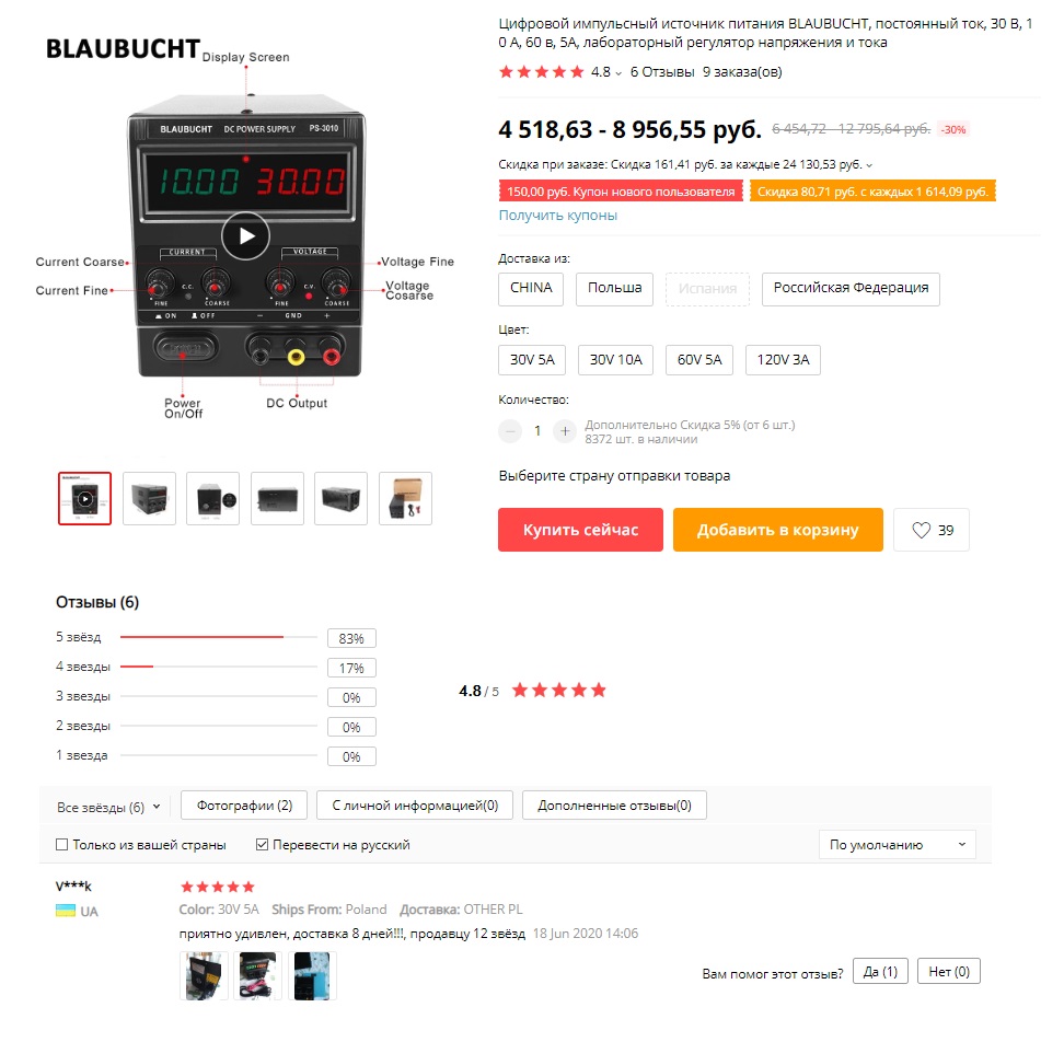 Модель, с названием бренда Blaubucht под номером BC-PS3010, значится как однофазная, предназначенная для регулировки напряжения в лабораториях. При входных AC 110V/220V 50/60Hz и выходных 0 ~ 30 В/60 В/120 В параметрах и типе тока DC. Отзывы подтверждают точность работы прибора:
