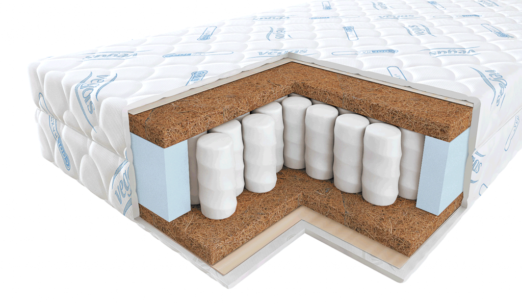 - Кокосовая койра – самый дорогой вид наполнителя. Является полностью натуральным и повышает ортопедический результат от использования матраса. Более жесткий материал в сравнении с латексом. Для придания матрасу средней жесткости достаточно прослойки шириной в 1 см, а ширина в 3 см придаст матрасу повышенную жесткость.