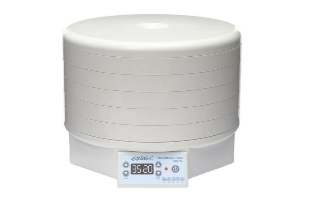 Еще одна сушилка конвективного типа с мощностным потенциалом в 600 Вт. Она имеет цилиндрическую форму и вертикальную подачу воздуха. Пригодна для сушки мяса, рыбы, грибов, ягод и разнотравья. Рабочий объем дегидратора — 30 л, в наличии шесть поддонов диаметром 39 см.