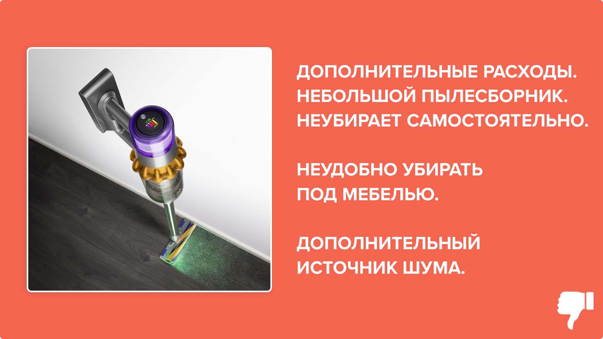 - О третьем недостатке я уже вскользь упоминал. Робот позволяет закинуть ноги на спинку дивана и наслаждаться жизнью, а с вертикальным пылесосом проводить уборку придётся самостоятельно.