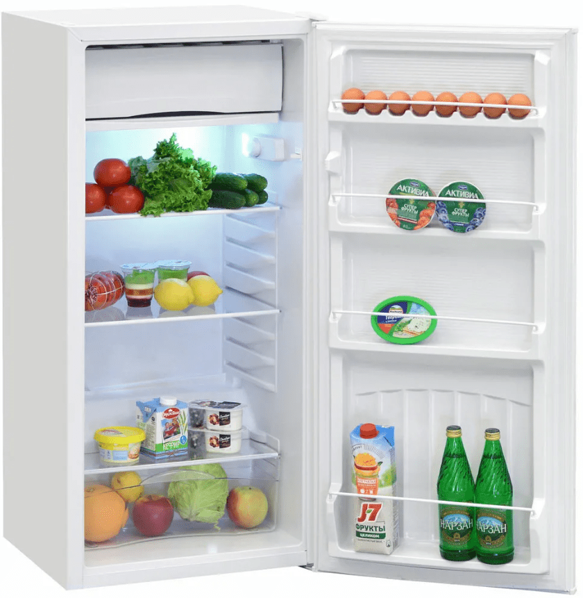 Это одна из самых удобных моделей для небольшого помещения. Ее габариты — 50 x 86 x 53 см. Чтобы сэкономить место продуманы даже мельчайшие детали, вплоть до утопленной в корпус эргономичной ручки. Вместимость холодильника 111 л, которая полностью приходится на холодильный отсек. В камере имеются стеклянные полки, регулируемые по высоте, а также контейнеры для хранения овощей. NORD 507-012 размораживается по капельной системе.