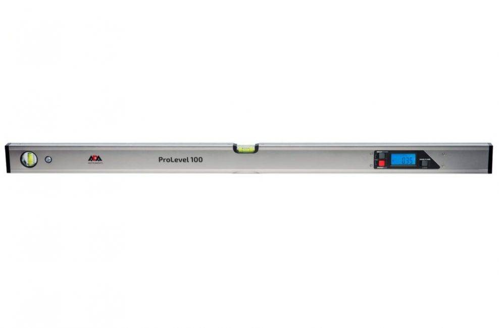Универсальный строительный уровень для контроля уклона в трех плоскостях. В центральной части и с левого торца имеются пузырьковые капсулы, с правой стороны расположен цифровой дисплей для точных измерений по показаниям датчиков-гироскопов с автоматической калибровкой. В метровом корпусе установлены магниты для работы на металлических поверхностях.