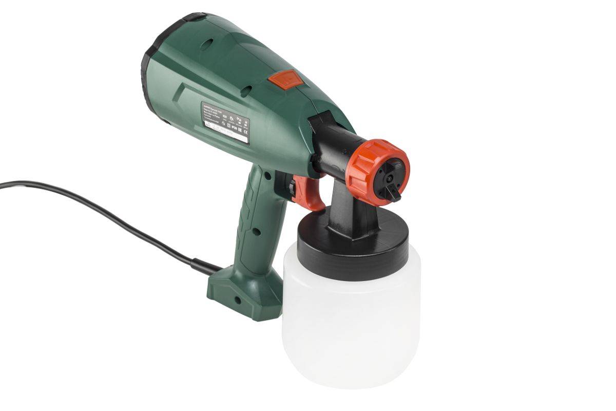 Краскораспылитель укомплектован однофазным коллекторным двигателем. Двойная изоляция обеспечивает эффективную защиту от поражения электрическим током. Емкость для распыляемых составов расположена в нижней части пистолета и не закрывает обзор. Работает с низким давлением, равномерно распределяя лакокрасочный материал. Максимальная допустимая вязкость позволяет наносить эмали, лаки, антисептики.