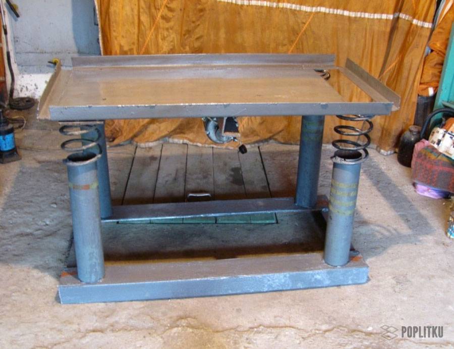 Чтобы сконструировать станину, понадобится шлифовальная машина (угловая), и сварка. Можно воспользоваться любой схемой вибростола, либо использовать произвольные расчеты. Конструкция выполняется так: