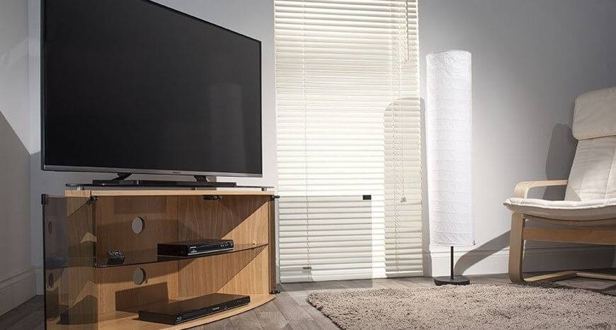 - Хороший обзор — главная деталь для размещения тумбочки под телевизор. Его должно быть удобно смотреть, высокая мебель или декоративных мелочей (например, вазы) не должны мешать смотреть картинку.