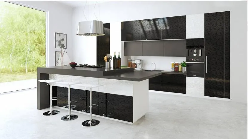 Стилевое направление модерн допускает наличие разных материалов для мебели – натуральные, синтетические, комбинированные. Обустройство кухни близкое к минимализму с акцентами. Элементы роскоши – нормально для модерна. Поэтому столешница гарнитура и барной стойки из натурального камня или массива придется к месту. Цветовая палитра обширная – теплые оттенки гармонично сочетаются с холодными, блеклые с яркими.