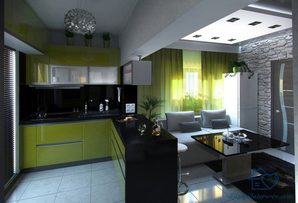 Таким образом, оформив небольшой кухонный островок, ещё остаётся место и для зоны отдыха. Правда, реализовать это для небольшого помещения можно с большим трудом. Вообще же для тесных студий лучшим решением будет не П-образная форма кухни, а Г-образная, когда вся кухонная мебель расположены в углу. Обеденную зону тогда можно сделать со складным или выдвижным столом, который раскладывается из зоны готовки.