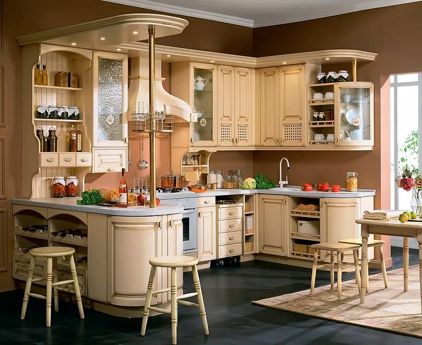 В старинные направления дизайна барная стойка не вписывается, но стилизованный угловой кухонный мини гарнитур с таким дополнением станет одним из стильных акцентов классики. В классическом дизайне популярны бары из дерева, украшенные эффектной вырезкой на фасадах, нередко стилизованные с помощью столешниц из натурального или декоративного камня.