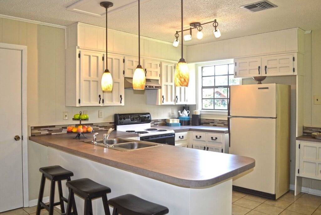 Получается, если роль обеденного стола на кухне играет барная стойка, то основное освещение должно быть по центру кухне, а барную стойку выделяют дополнительно.