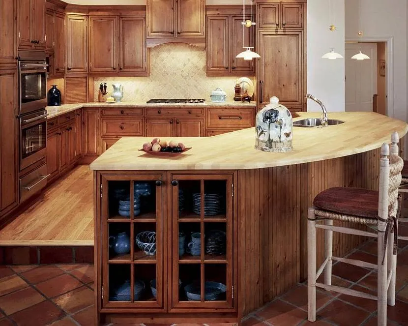 Обычно зону фартука выкладывают плиткой. Хорошо сочетается с этим стилем плитка квадратная, не очень большая, с широкими швами. Наоборот, современная крупная плитка или бесшовная будут смотреться несколько аляповато. Также неуместно использовать декоративные стеклянные панели-фартуки — они плохо сочетаются с этим стилем.