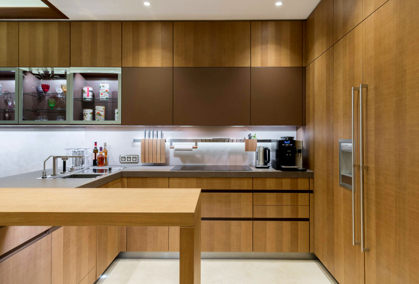 Дизайн включает угловой кухонный гарнитур и присоединенную к нему с одной стороны барную стойку. Она может располагаться возле третьей смежной стены или свободно, с доступом с обеих сторон. Общий вид конструкции в форме буквы П. Это удачный вариант оформления для квартиры-студии, барная стойка здесь выполняет роль обеденного стола. На кухне-гостиной можно оформить полноценный бар, установить над столешницей и под ней полки для хранения посуды, кухонных мелочей.