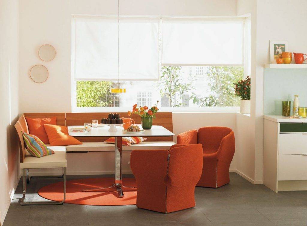 Яркий оранжевый полукруглый диван, подходящий к овальной форме стола