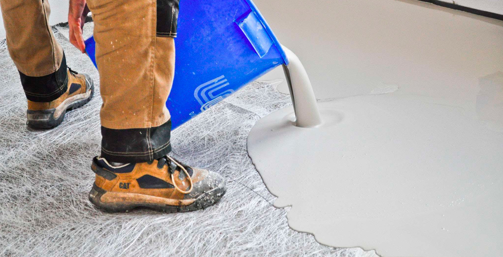 Если полы бетонные, и на них много выбоин, трещин и сколов, первым делом важно заделать эти дефекты обычным цементным раствором. После этого основание грунтуется для улучшения адгезии, затем полы выравнивают с помощью цементной стяжки