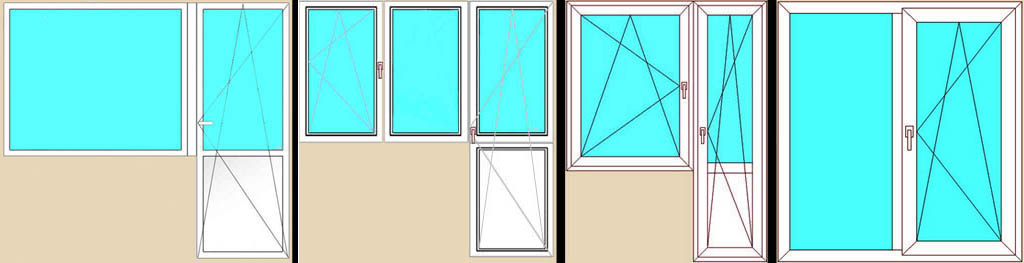 Самые распространенные конструкции балконных блоков показаны на рисунке. Цена возрастает слева направо. Для любого типа блока дверь только распашная, без возможности откидывания, уменьшит цену блока на 4-7%. Но для вентиляции утепленного балкона с такой дверью придется дополнительно поработать, см. ниже. Назначение показанных конструкций следующее, в порядке слева направо: