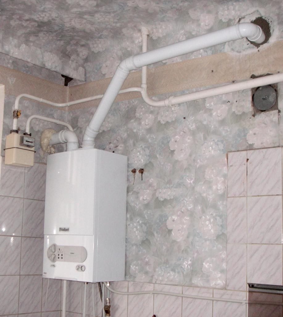 В закрытых помещениях с отсутствием свободной циркуляции воздуха необходима установка вытяжной трубы для предотвращения концентрации угарного газа в случае аварийной утечки. Если газовый котел планируется устанавливать в кухне, удачным решением послужит совмещение кухонной вытяжки над газовой плитой и вентиляционной трубой. К отверстию в потолке через гибкую гофрированную трубку диаметром не менее 10 см присоединяют вытяжную трубу, выступающую на 50 см выше конька крыши дома.
