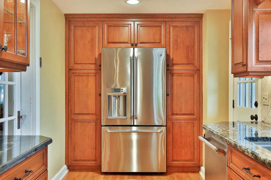 Если вы хотите полностью встроить холодильник в пенал кухонного гарнитура, выберите способ крепления дверцы: