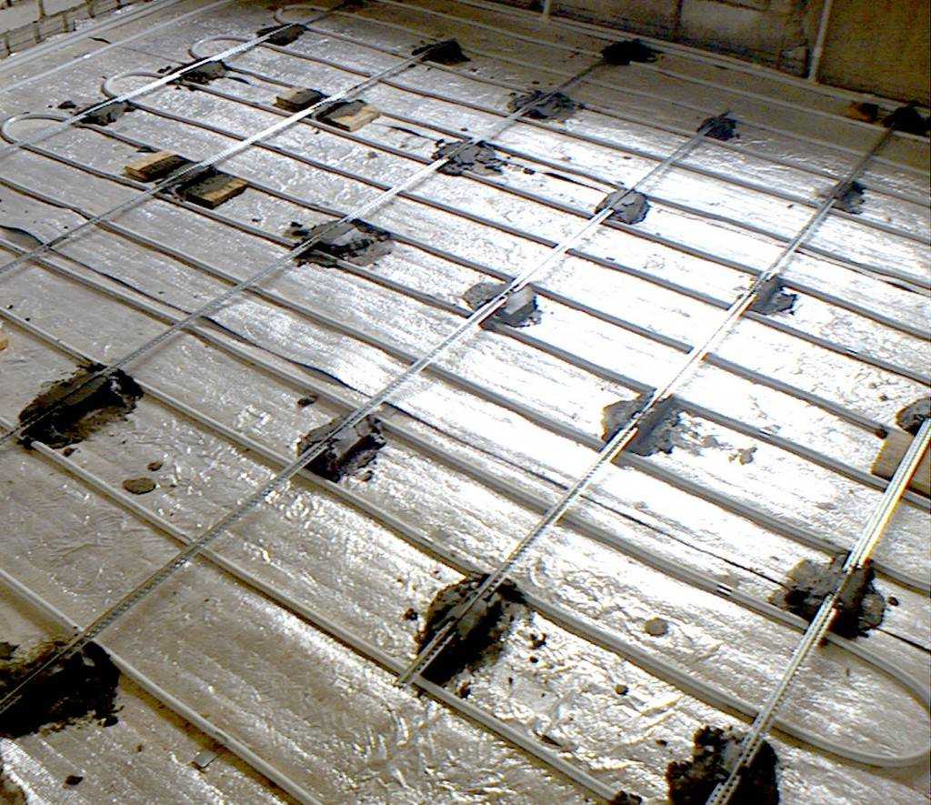 Трубы к полу крепятся при помощи смеси для стяжки. Её выкладывают небольшими порциями на линии разметки основания с интервалом в 40-50 см. После, на состав укладывают трубы и слегка вдавливают их в раствор.