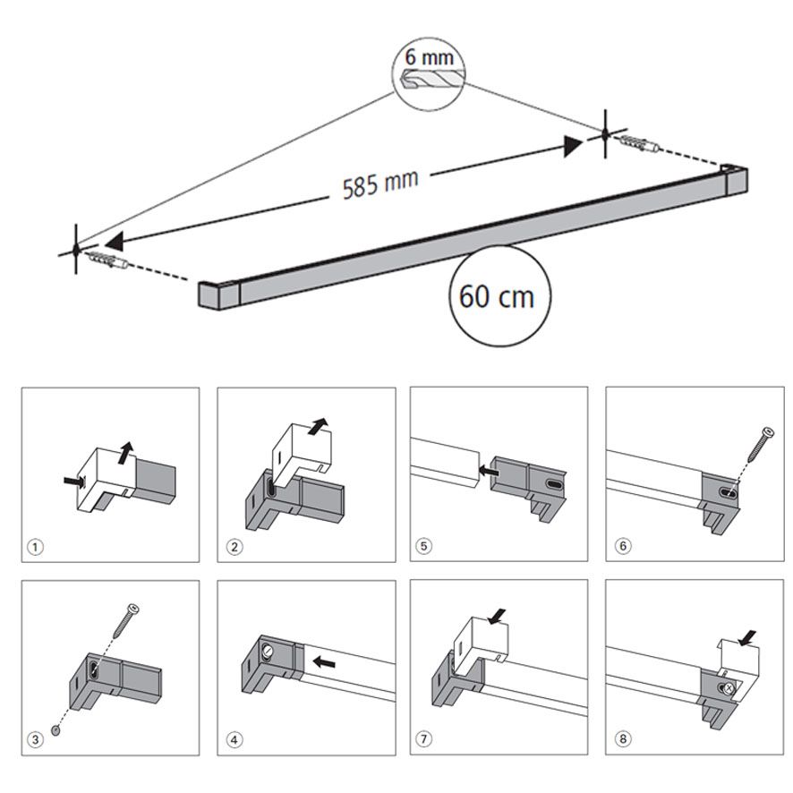 На втулки надевают настенные держатели, через которые продевают штангу. С двух концов она должна выступать на равное расстояние. Опора – это трубчатая или прямоугольная деталь с двумя отверстиями – большим для штанги, маленьким для втулки. Заключительный шаг – фиксация положения рейлинга в настенных держателях с помощью винтов и шестигранного ключа, которые входят в комплект. Останется лишь протереть штангу, вставить заглушки и развесить крючки.