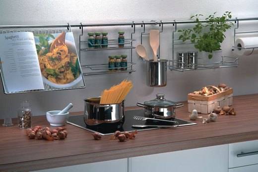 Также будет весьма удобно поместить такую конструкцию небольшого размера на стенке шкафа. Узнав, как прикрепить рейлинг на кухне, вы сможете сэкономить свободное пространство в помещении. И, кроме того, сократите время, необходимое для приготовления пищи.