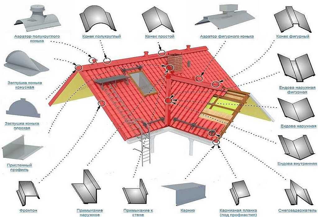 - Самих профилированных листов, а также других материалов, которые требуются для сооружения крыши: элементов обрешетки, доборных элементов, гидроизоляции, шумоизоляции, саморезов и пр.