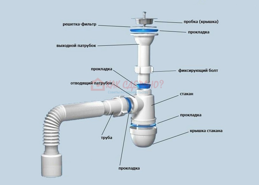 Устройство сифона при разных размерах, конструкционных решениях включает одинаковые элементы: