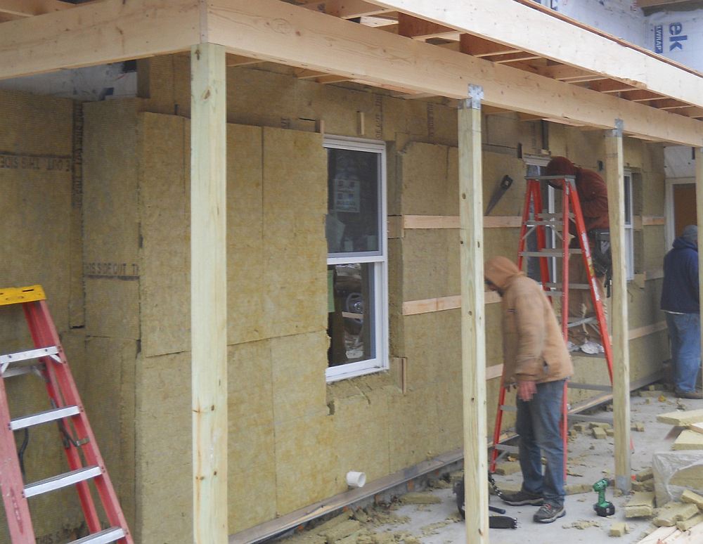 Довольно часто, особенно в холодных зонах страны, проводится двойное утепление каркасного дома. В этом случае с внешней стороны каркаса набивается обрешетка из горизонтально бруса. Между брусом враспор устанавливаются маты базальтовой ваты.
