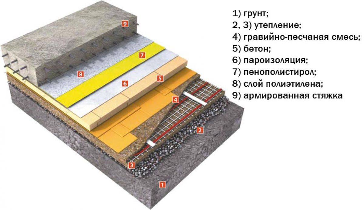 Беспрессовый пенополистирол можно использовать для утепления полов – бетонных и деревянных. В первом случае утеплитель укладывают под бетонную стяжку таким образом, что получается своеобразный «пирог». Его слои: