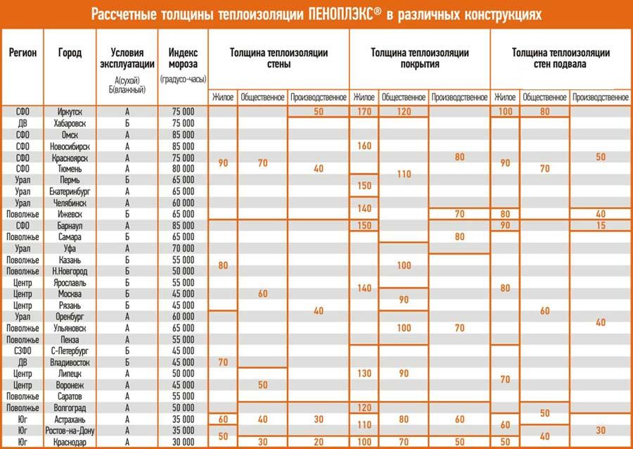 Усредненные данные по толщине теплоизоляции экструдированным пенополистиролом «Пеноплэкс» в зависимости от города и конструкции приведена в таблице: