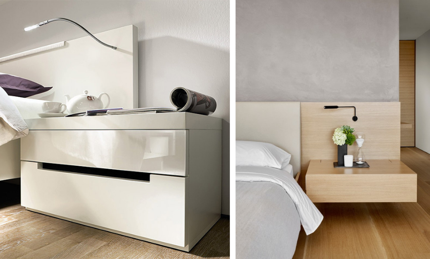 Если позволяет выбранный стиль оформления спальни, от них можно отказаться, заменив на навесные полки. Есть варианты размещения необходимых мелочей во встроенном в изголовье кровати мини-комоде.