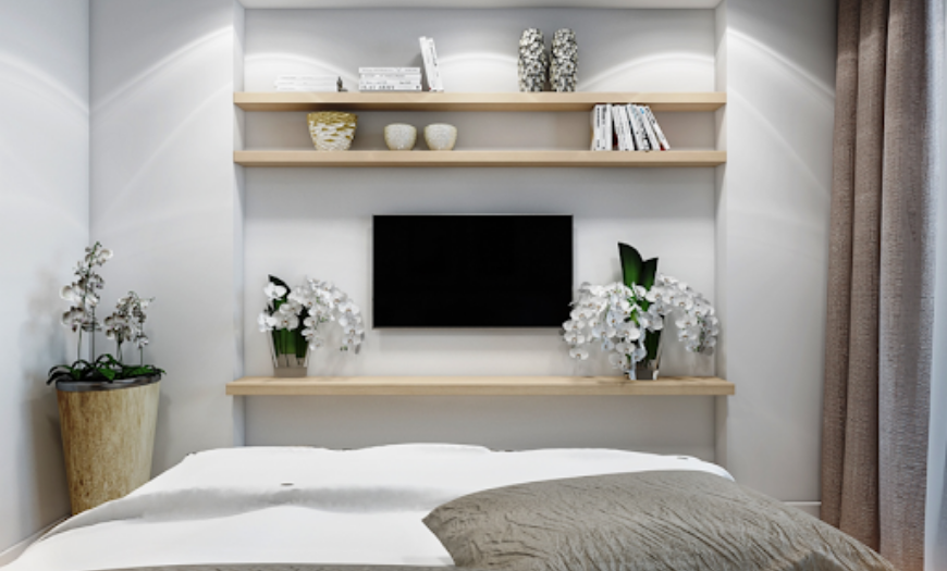 Существуют противники и сторонники размещения телевизора в зоне отдыха. Если вы относитесь к последним, то ставить ТВ надо так, чтобы его было удобно смотреть. Лучше всего повесить с помощью кронштейна на стену напротив кровати.