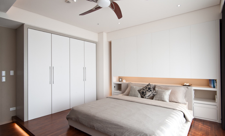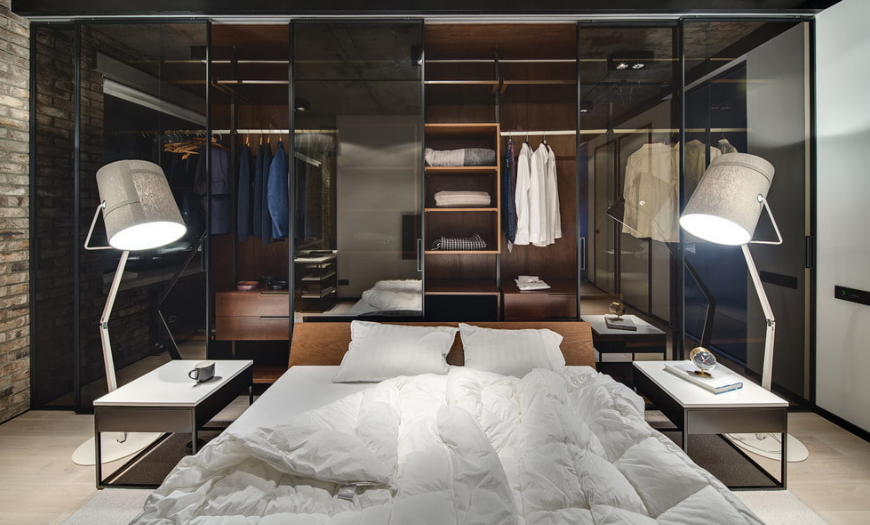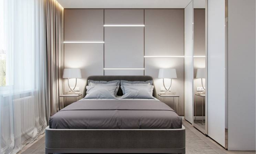 Если позволяют счетчики, в спальне можно разместить шкаф-купе. Будет лучше, если это будет отсек на всю стену и до потолка. Гардероб также идеально подойдет для крохотной спальни, где вы расслабляетесь и одеваетесь, храните свои личные вещи. Он будет незаметен на первый взгляд и придаст помещению квадратную форму. Конструкция купе абсолютно не помешает повседневной жизни и не «ворует» дорогие счетчики. Он может стать целым акцентом в комнате и помочь в ее зонировании.