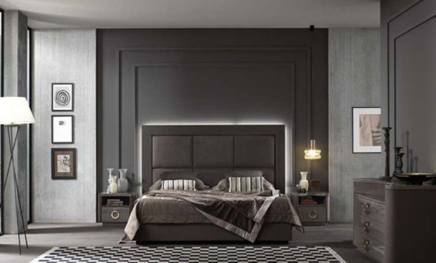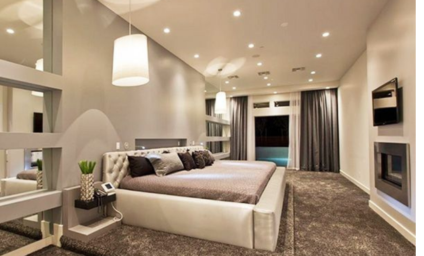 В современном стиле преобладают светлые тона отделки стен, а основной упор делается на кровать.