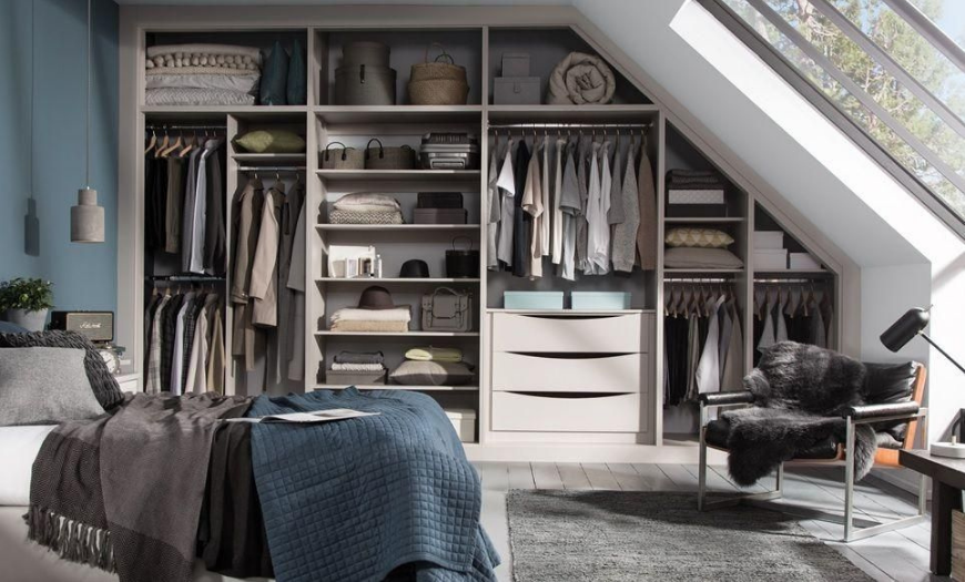 Оптимальное решение — встроенный шкаф-купе. Внутренний объем позволит разместить все необходимое, а дверцы открываются без помех. Шкаф можно оформить в той же цветовой палитре, что и стены, или украсить зеркалами.