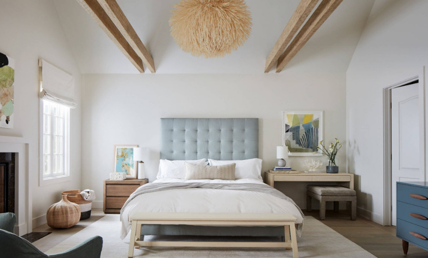 Также стоит обратить внимание на бежевую стену за изголовьем. Такой прием очерчивает границы комнаты и украшает интерьер без лишних элементов. В следующем интерьере стоит выделить эффективное использование пространства над прикроватными тумбами