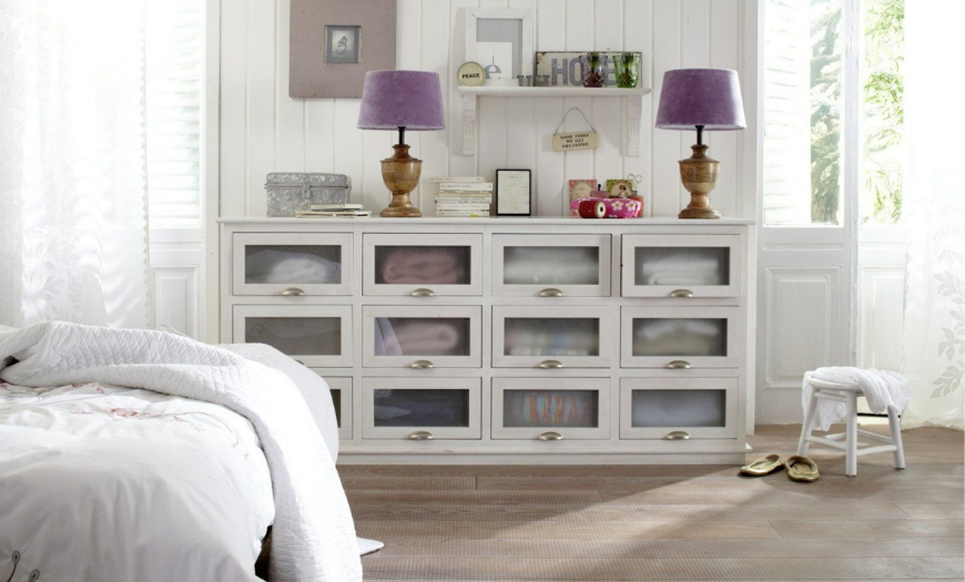 Комод может служить тумбочкой для косметических процедур, прикроватная тумбочка может использоваться как журнальный столик, освещенный небольшой прикроватной лампой.