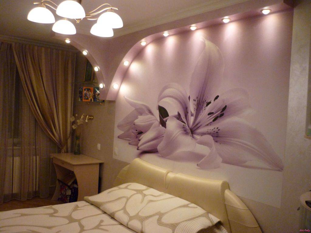 В узкой спальне прекрасно будет смотреться объемная люстра, мягко рассеивая свет, помогая визуально скорректировать пространство. Для зонирования используются точечные светильники, встроенные в поверхность потолка.