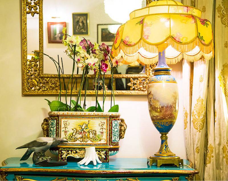 Повсюду – множество старинных вещей в оригинальном исполнении, например, антикварный комод со старинной лампой. Рената сама изготовила для нее абажур, а материалом для него послужил кусок материи, оставленный ей ее бабушкой. Над комодом размещено зеркало в позолоченной лепной раме.