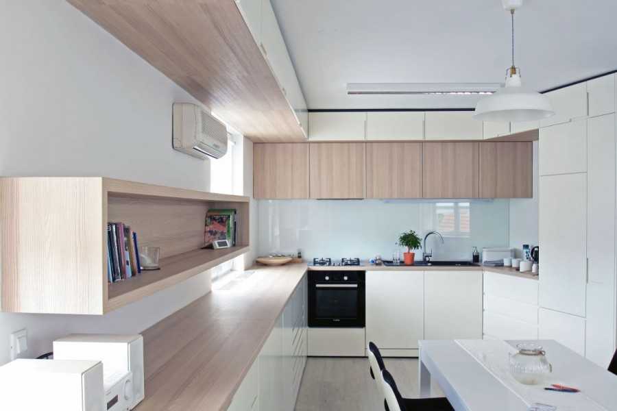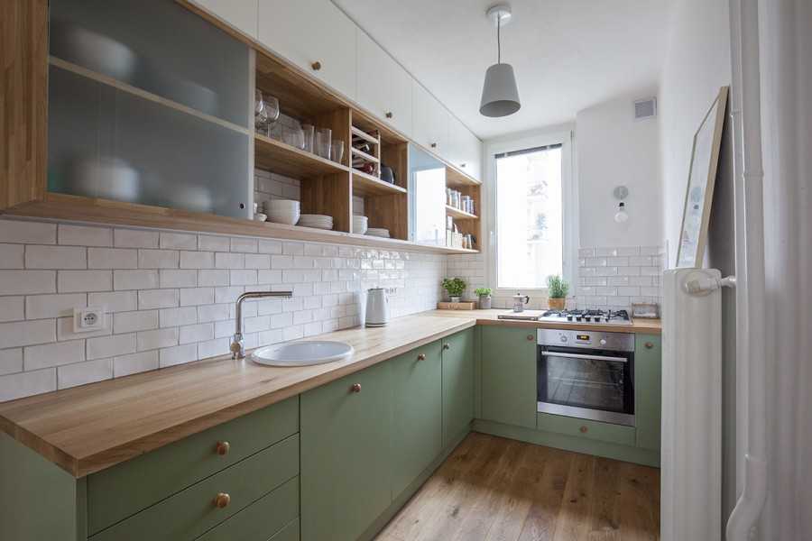 Если кухня с углом и короткой стороной, вешайте шкафы по длинной стороне.