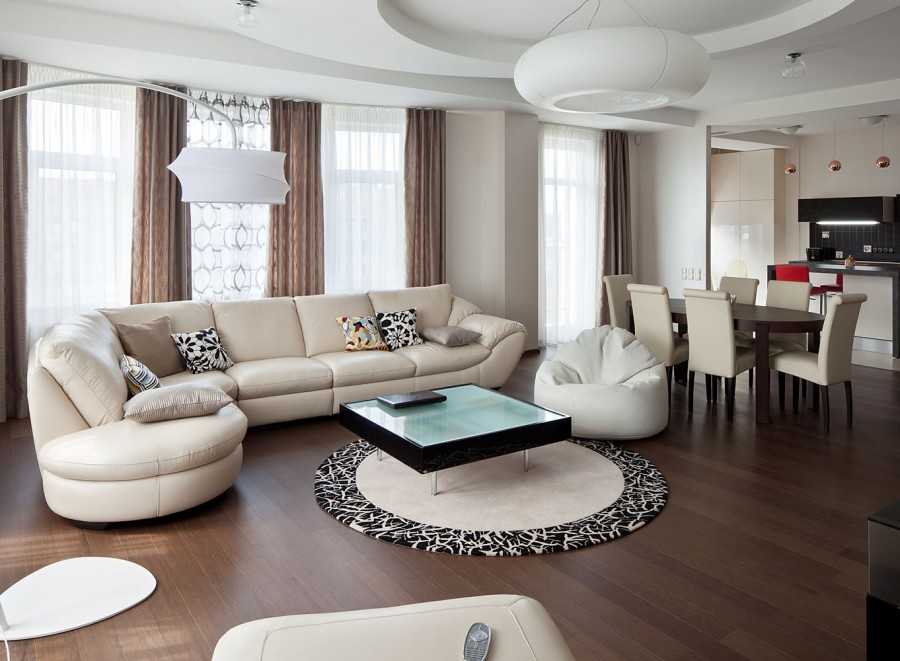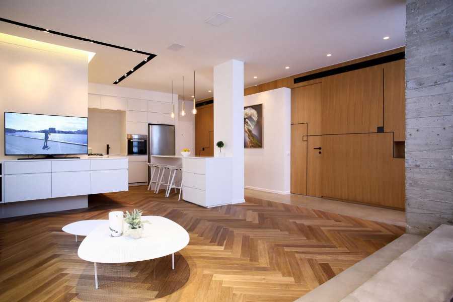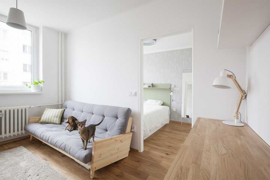 Уютный дизайн интерьера маленькой квартиры с единым напольным покрытием