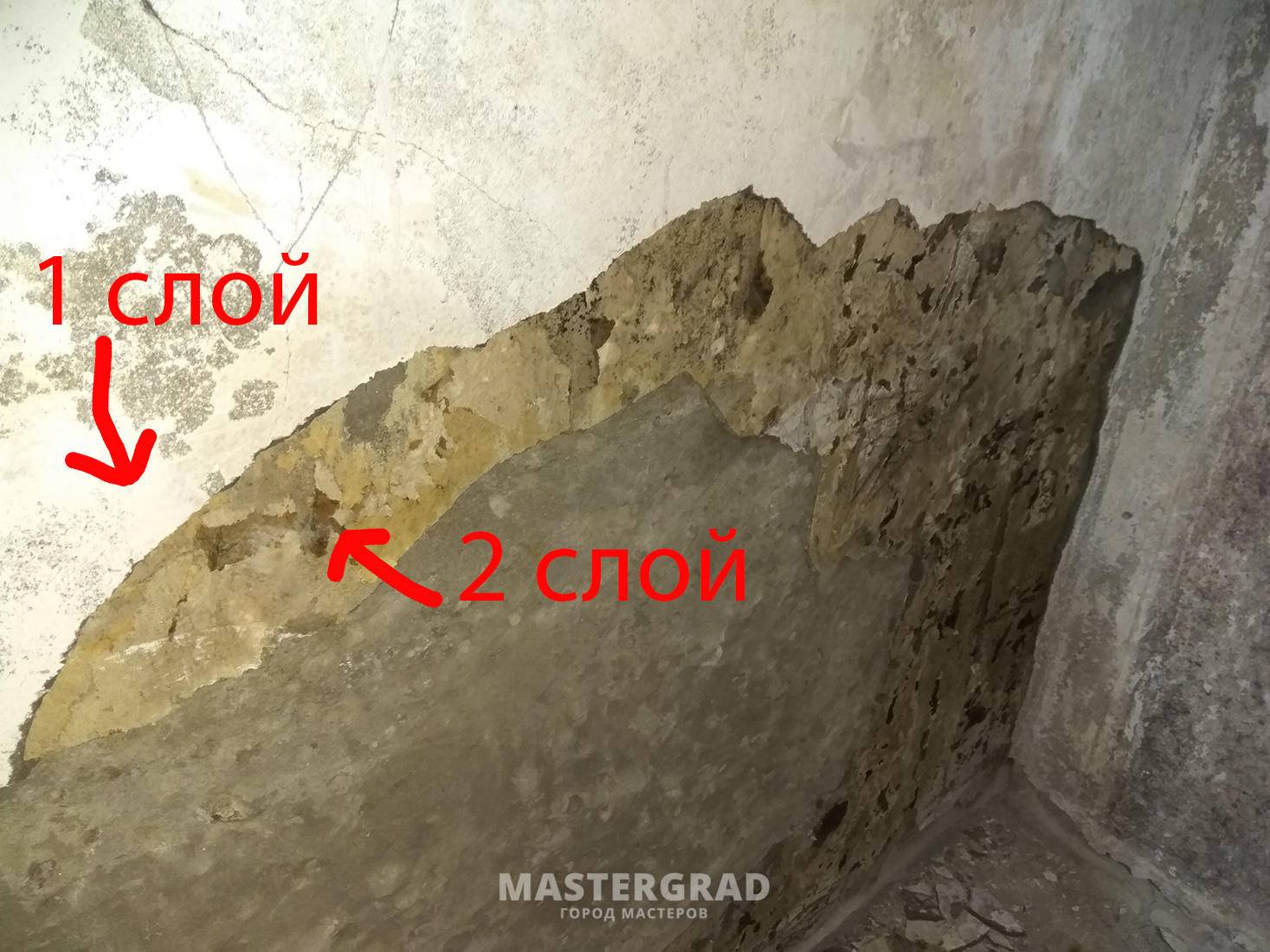 Решено было добираться до основания. Демонтировал гипсокартон. Стена за гипсокартоном была влажная. Дальше начал счищать с этой стены тонкий слой гипсовой шпаклевки. Счистил. Под шпаклевкой оказалась что-то типа советской цементной штукатурки. Вся в трещинах. И тут я кое-что заметил. При постукивании по этой штукатурке, звук по всей стене был глухой, как от гипсокартона. И если нажимать пальцами в трещины, то штукатурка ходит ходуном и хрустит.