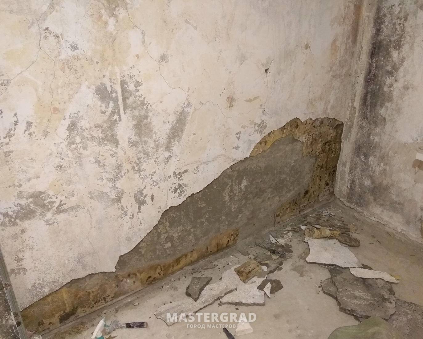 Чтобы избавиться от этой проблемы, придется очистить стены от отсыревшего покрытия, оштукатурить их, прогрунтовать, а также покрыть гидроизолирующей мастикой.