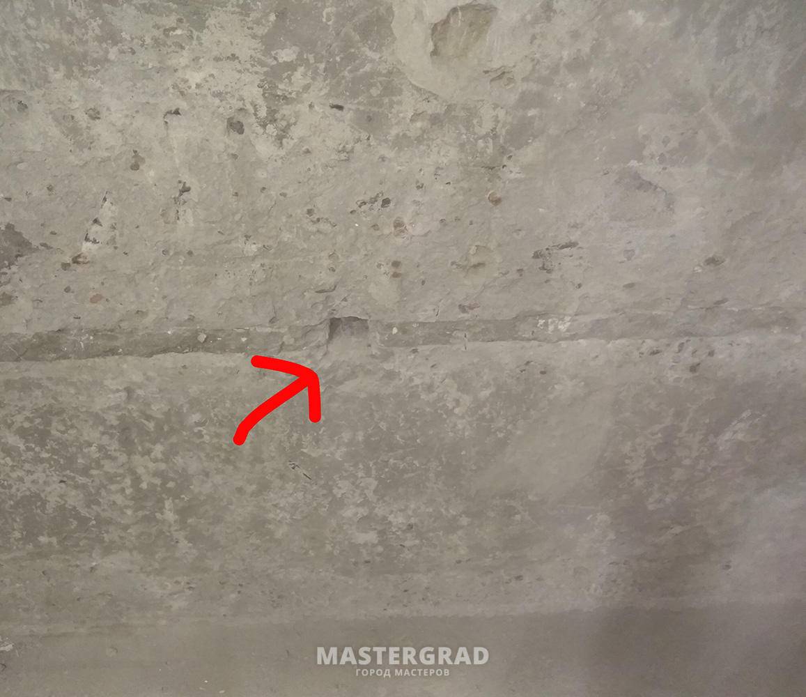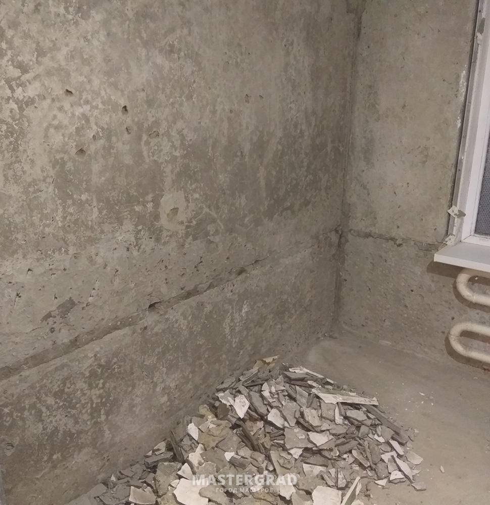 Начал все сбивать. Пришлось за каской идти. Тяжеленные глыбы падали от одного маленького удара. Сбил все до основания. Я так понимаю до керамзитобетона. Стали видны меж панельные швы.