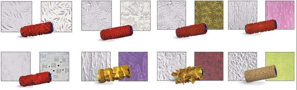 Для того чтобы создать декоративную отделку на стене используют различные губки, штампы, гребенки и аппликаторы, но их можно применять если масштаб работ небольшой. А нанесение штукатурки валиком позволяет достаточно быстро обработать большую площадь. В ассортименте магазинов выделяют несколько видов фактурных валиков: