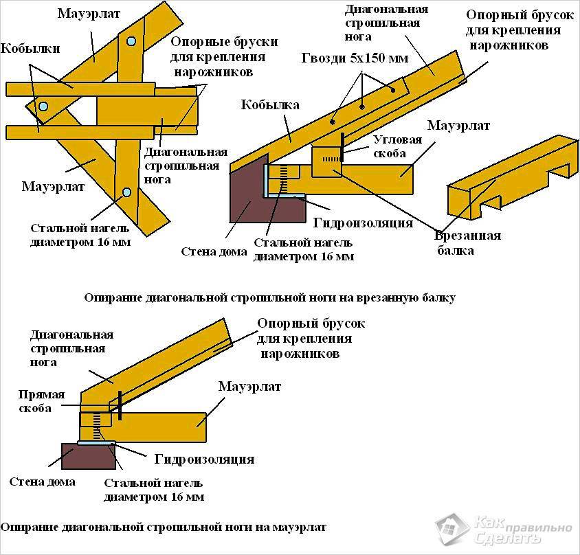 Достаточный свес крыши обеспечивают длиной стропильных ног или с помощью прибиваемых досок «кобылок». Стропильные ноги фиксируются к мауэрлату несколькими способами: скобами, металлическими уголками, гвоздями. На коньке стропила соединяются при помощи скосов и крепятся металлическими пластинами. После этого выполняется монтаж обрешетки.