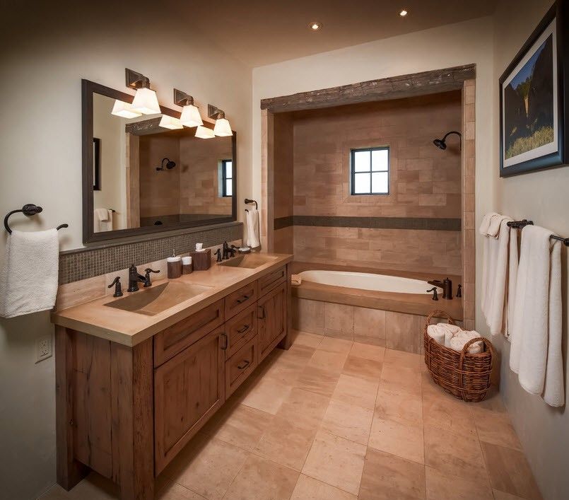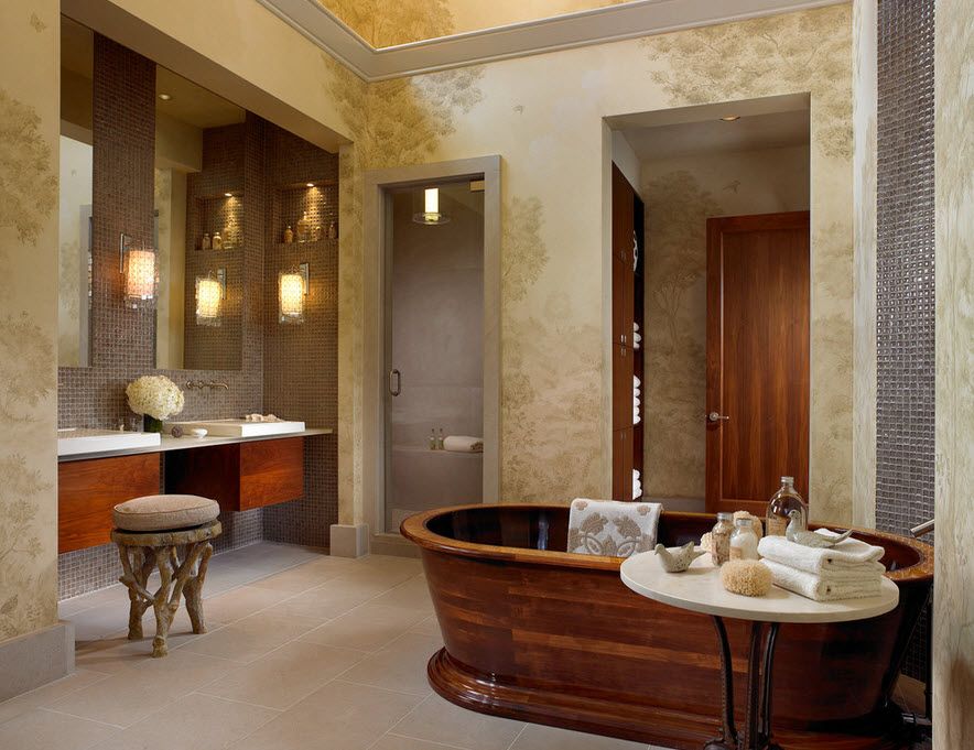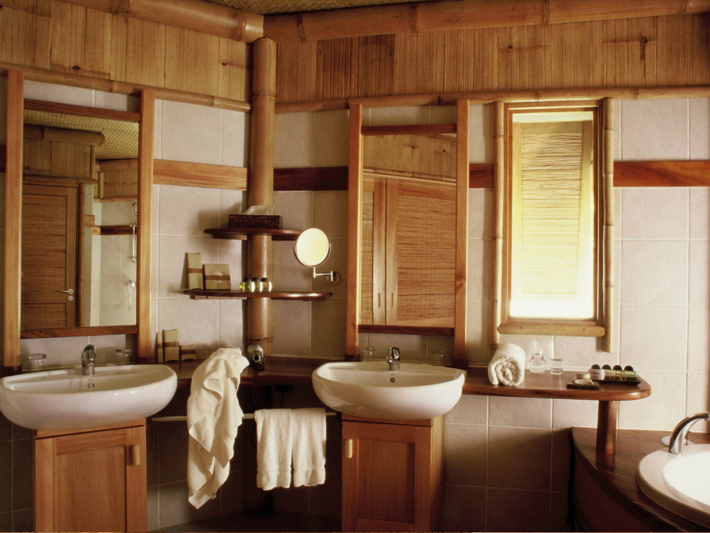 Для этого варианта оформления ванной комнаты характерно широкое применение дерева. Все иные материалы, например, металл или пластик, должны использовать минимально. Если есть возможность, лучше применить для отделки помещения натуральное дерево, например, дуб, бук или ясень. Дерево хвойных пород лучше не использовать из-за наличия в нём смолы.