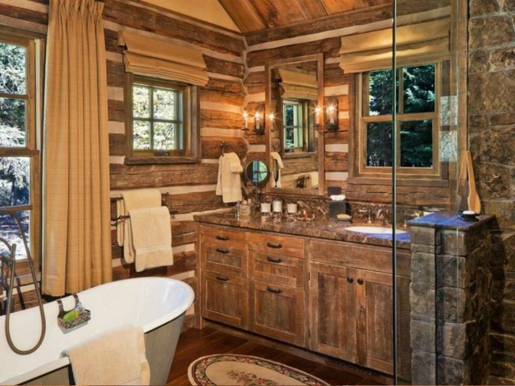 Ванная комната в деревенском стиле может быть выполнена и по-русски. В этом случае помещение будет походить на деревянную русскую избу или баню. Такой вид оформления помещения все больше входит в моду, так как даёт возможность жителям городов вспомнить родную деревню и расслабиться, ощутив единение с природой.