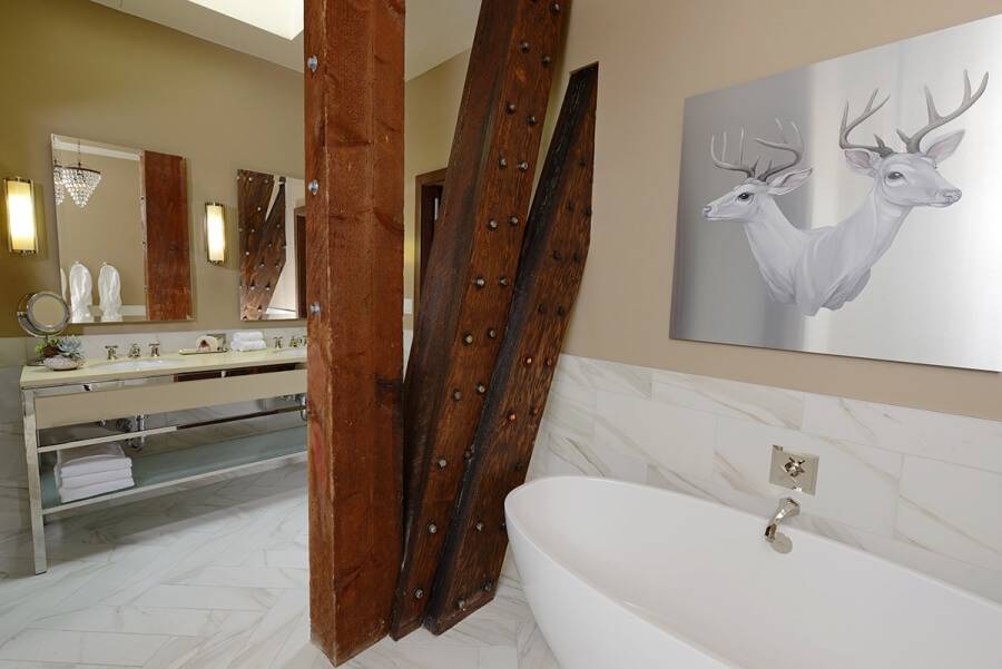 Ранее отмечалось, что в лофт-интерьерах общее помещение не принято делить на отдельные комнаты. Однако это требование урбанистического стиля не распространяется на санитарные узлы, которые все же отделяются от остального жилого пространства перегородками, выполненными из поликарбоната, матового или прозрачного стекла, вагонки и иных аналогичных материалов.