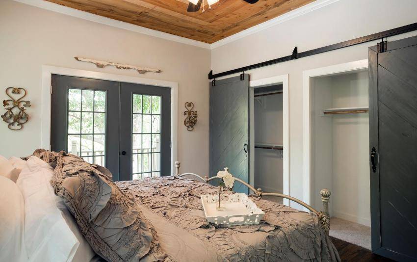 Двери из деревянных реек создадут уют в стиле эко. Прозрачные стеклянные фасады шкафов в сочетании с деревом могут подойти любителям винтажа.