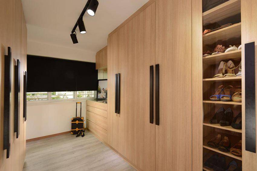 - просторные полки под потолком для подушек, одеял, постельного белья, в нижней части — для обувных коробок, ботинок;